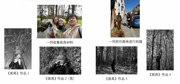 在另外一个面具创造和摄影的项目里,我与 Noa 和 Tiphaine 合作完成了藤条编织面具项目。我们亲自采集自然材料,结合森林环境进行拍摄,面具象征着保护与成长。Noa 的弟弟也参与拍摄,扮演年幼的树苗,表达生命从依赖到独立的过程。根据 Carolina 老师的建议,我们学习用 PS 对照片进行了局部调色,降低对比度,增强主体光感,使作品更具表现力。此次项目提升了我的设计技能和团队合作能力,也让我体会到设计与自然、文化的深度连接。